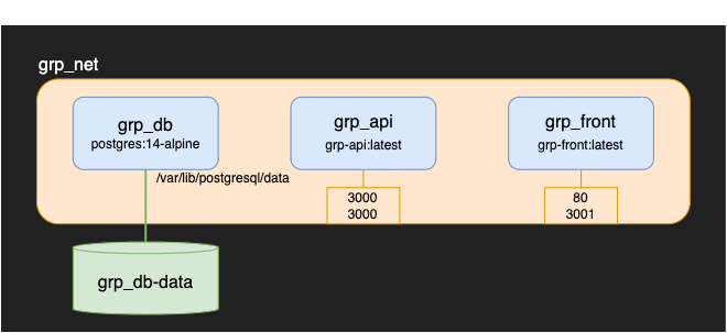 grp_db, construit à partir de l’imagepostgres:14-alpine, avec les variables d’environnement suivantes :POSTGRES_USER=admin→ Identifiant de la basePOSTGRES_PASSWORD=password→ Mot de passe de la basePOSTGRES_DB=grp→ Nom de la base